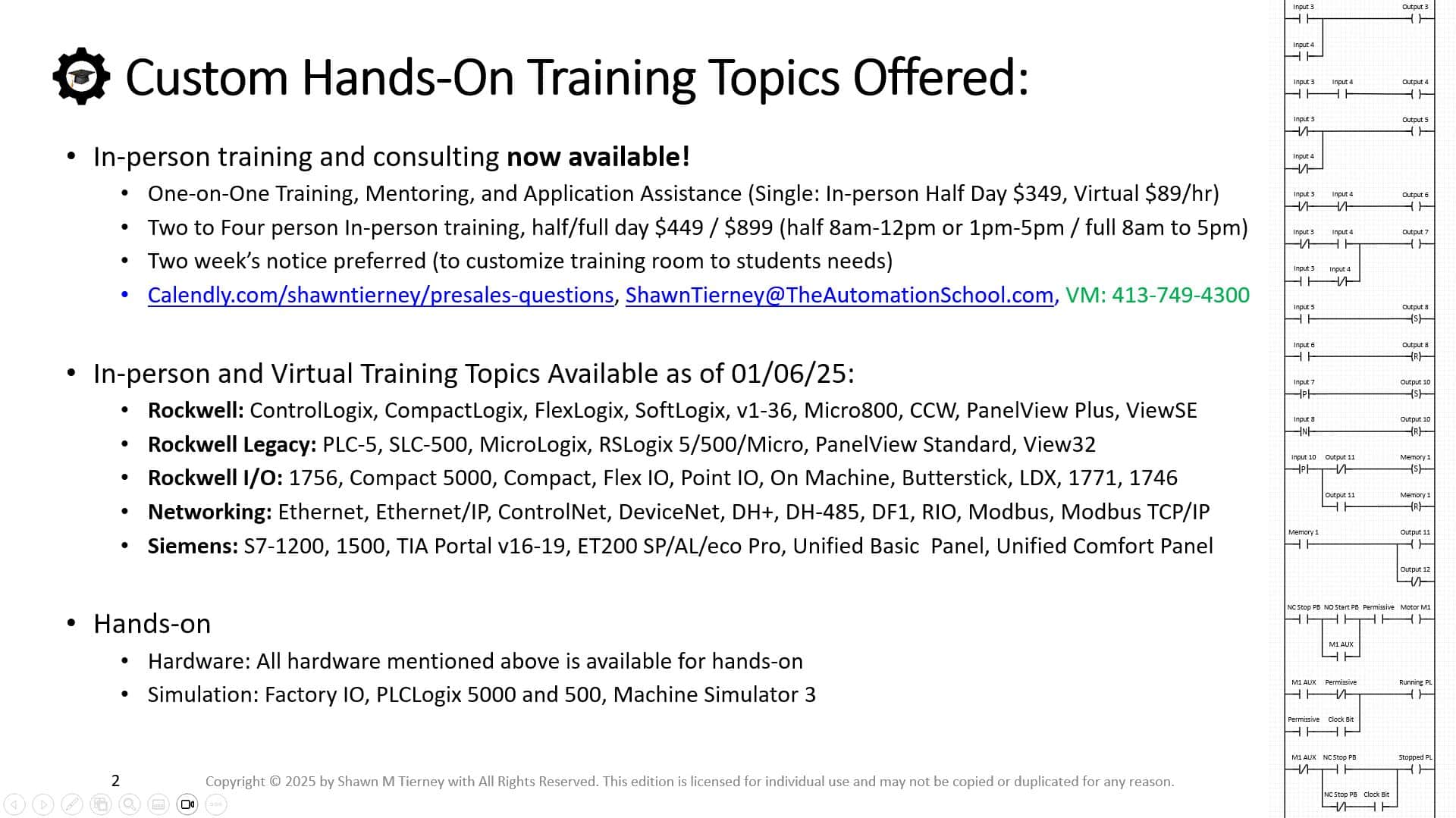 Whether you're an individual looking to upgrade your skills, or a manager who needs to train up your staff, The Automation School can help you meet your training goals with our in-person, hands-on training taught by a Certified Automation Specialist with over thirty-five years' experience.