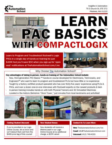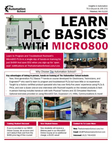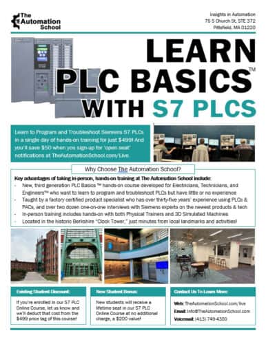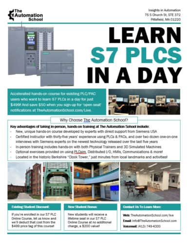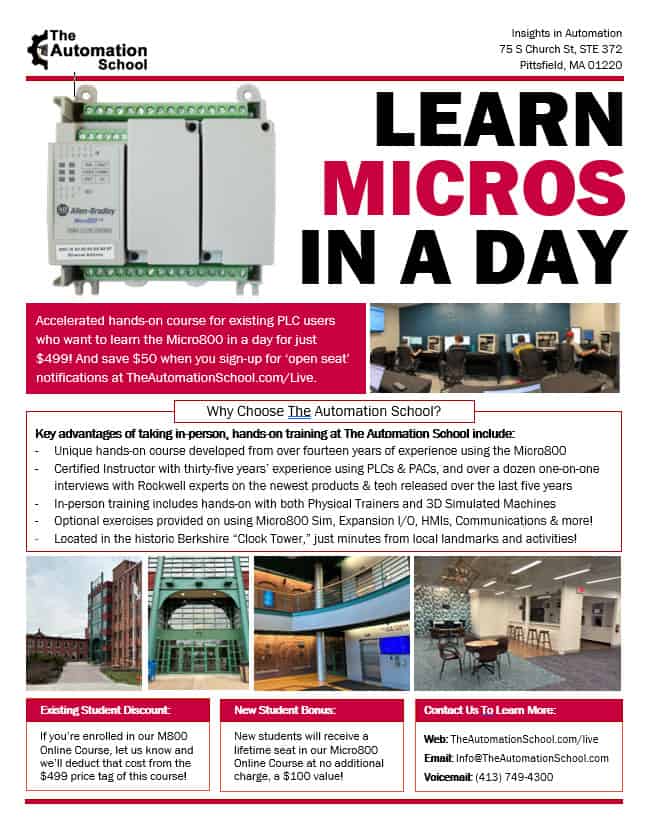 With the in-person edition, students can chose between courses focused on Studio 5000 with CompactLogix hardware, CCW with Micro820 hands-on, and TIA Portal Step 7 with S7-1200/1500 hands-on (click on an image below to pull up the corresponding PDF.)