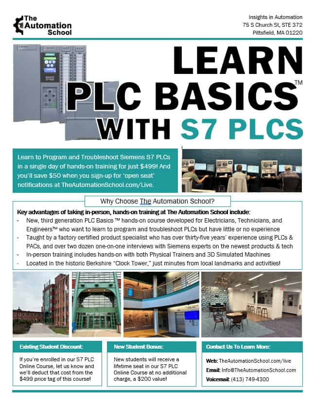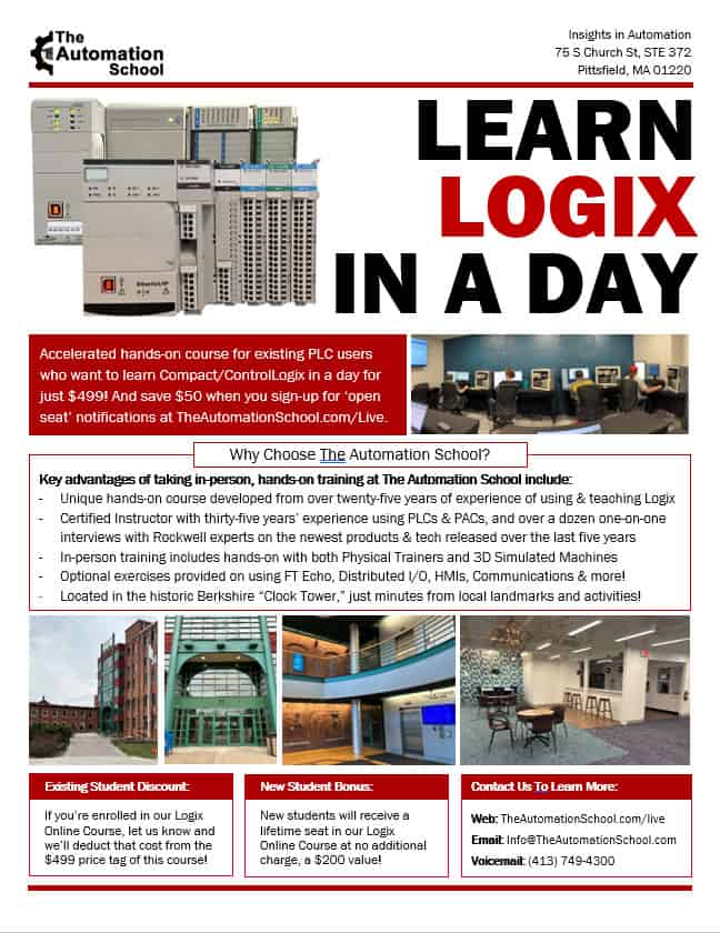 NOTE: To be successful in our “in a day” accelerated courses, students must already understand Programmable Controller Program Scans, Ladder Logic (including the most common instructions,) as well as the typical Data Types used (BOOL, BYTE, INT, DINT, REAL/FLOAT.)