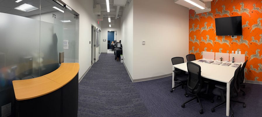 And below you can see our office in relation to the dining are, as well as the hall leading to the Learning Center: