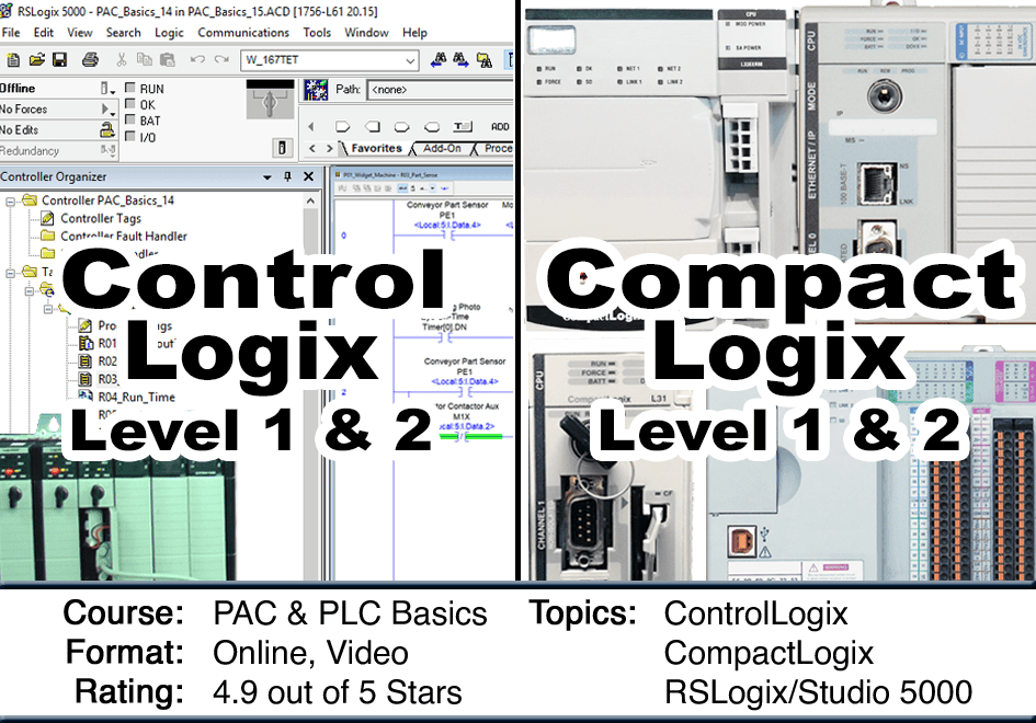 Compact Basics Level 1 and 2 course bundle is designed for those students who are already familiar with PLCs, and would like to learn how to setup, program, and troubleshoot the CompactLogix family of Small Programmable Automation Controllers (PACs) using RSLogix 5000 and Studio 5000 (Includes The Automation Minute and Show CompactLogix Episode Bundle! Full course details can be found HERE)